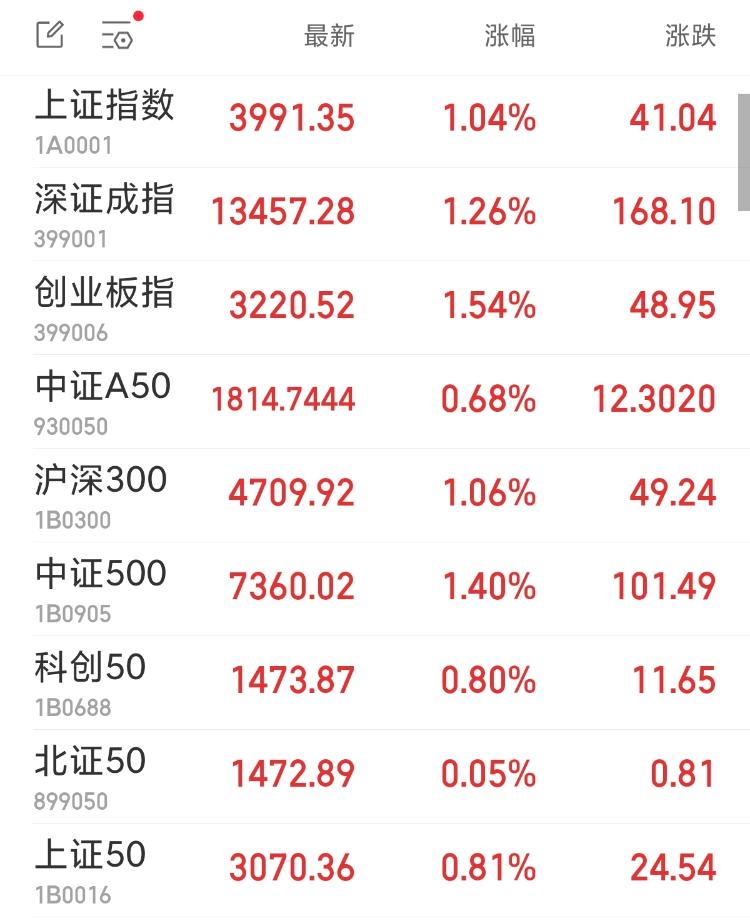 中新经纬10月27日电 周一早盘,A股三大指数高开高走,上证指数续创10年新高。截至午间收盘牛宝宝,上证指数涨1.04%,报3991.35点;深证成指涨1.26%,报13457.28点;创业板指涨1.54%,报3220.52点。