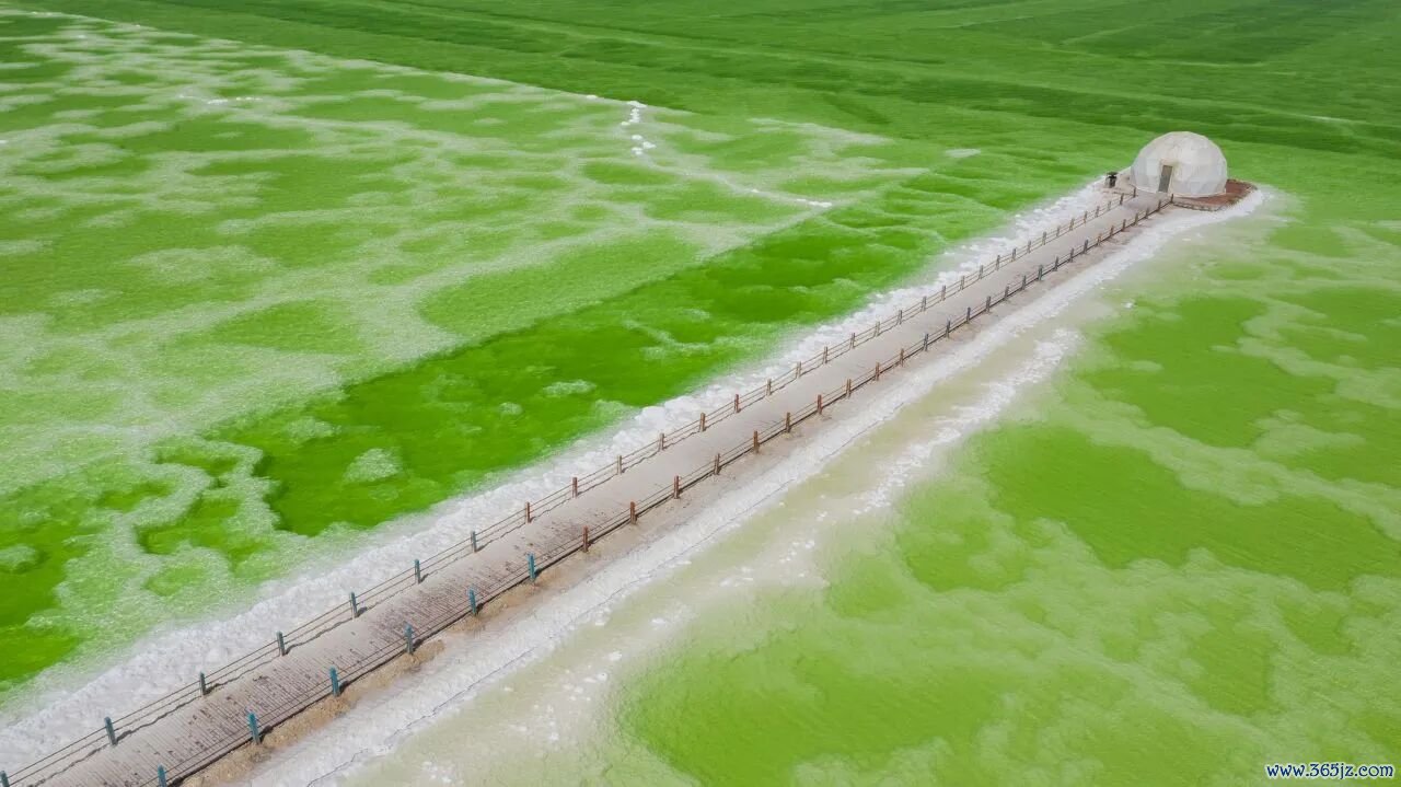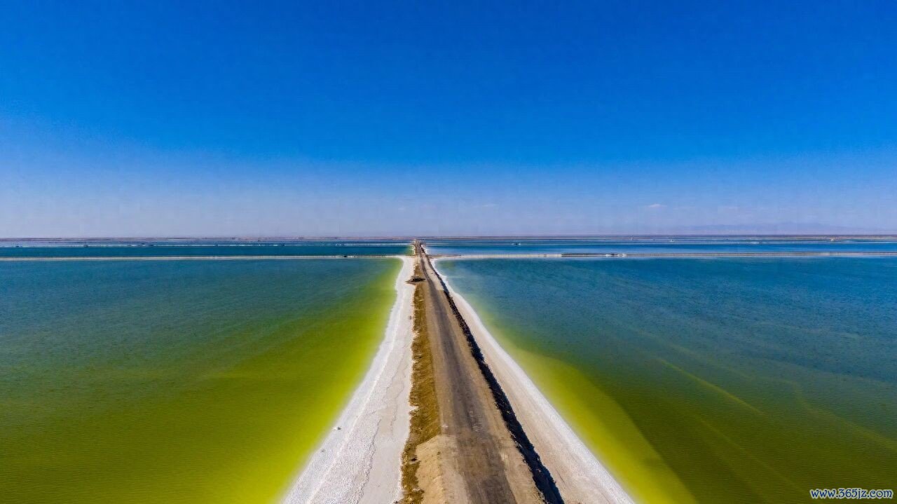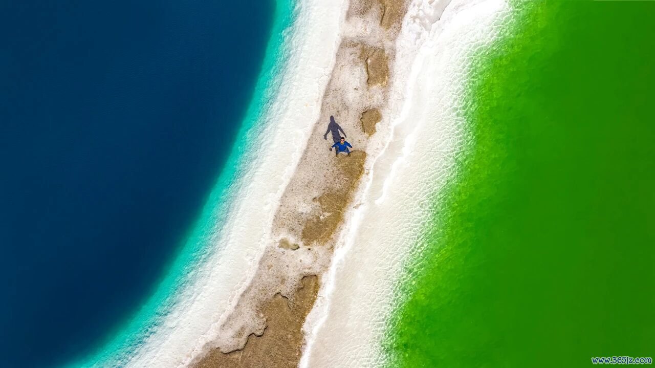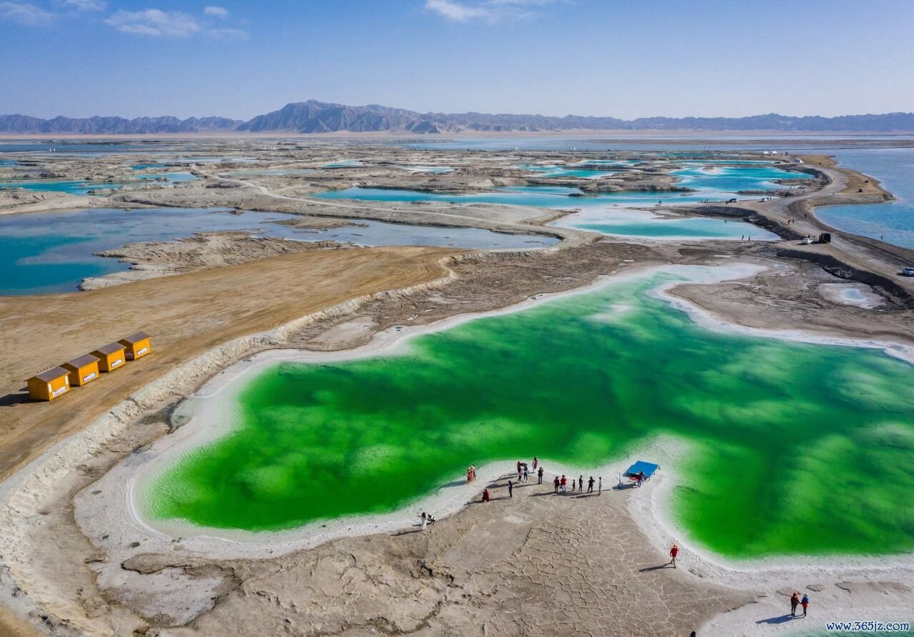 湖水的色彩极具美感,晴朗时,卤水在光照下呈现出从浅绿、青苹果绿到深翡翠蓝的渐变,像一块流动的翡翠。
